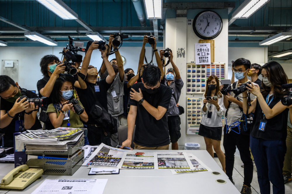 Executive editor in chief Lam Man-Chung proof reads the next day’s “Apple Daily" newspaper in Hong Kong on June 17, 2021, after police arrested the chief editor that morning.