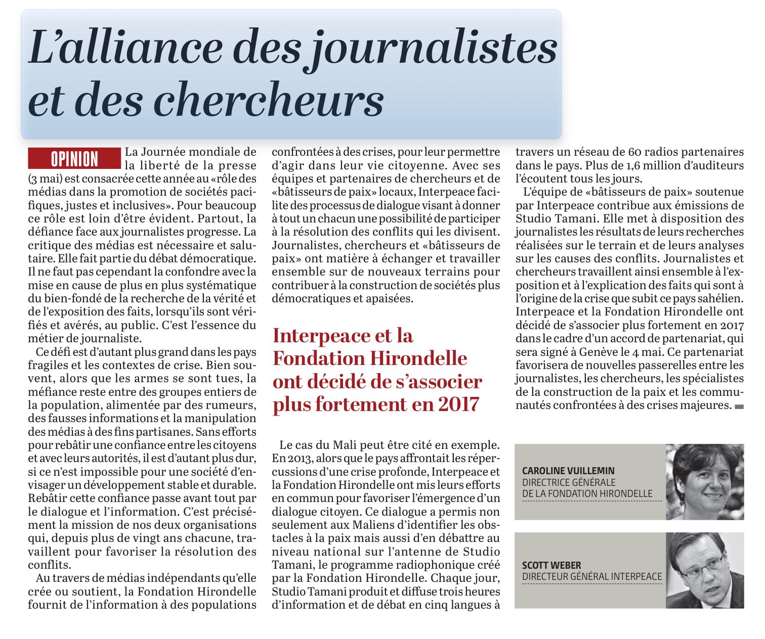An Op-Ed by Fondation Hirondelle and Interpeace’s CEOs published by the Swiss Newspaper „Le Temps“, on May 1st 2017, at the occasion of the signing of a partnership between our organisations…