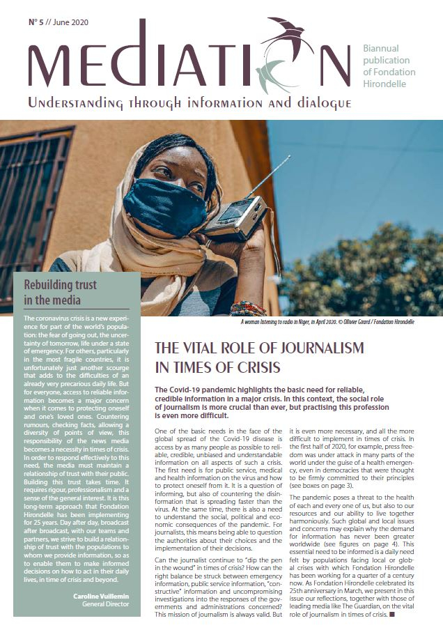 The pandemic poses a threat to the health of each and every one of us, but also to our resources and our ability to live together harmoniously. Such global and local issues and concerns may explain why the demand for information has never been greater worldwide (see figures on page 4). This essential need to be informed is a daily need felt by populations facing local or global crises with which Fondation Hirondelle has been working for a quarter of a century now. As Fondation Hirondelle celebrated its 25th anniversary in March, we present in this issue our reflections, together with those of leading media like The Guardian, on the vital role of journalism in times of crisis.