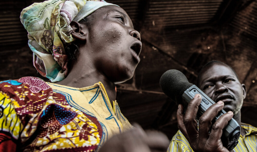 A woman interviewed by a Radio Ndeke Luka reporter at a market in Bangui, Central African Republic.