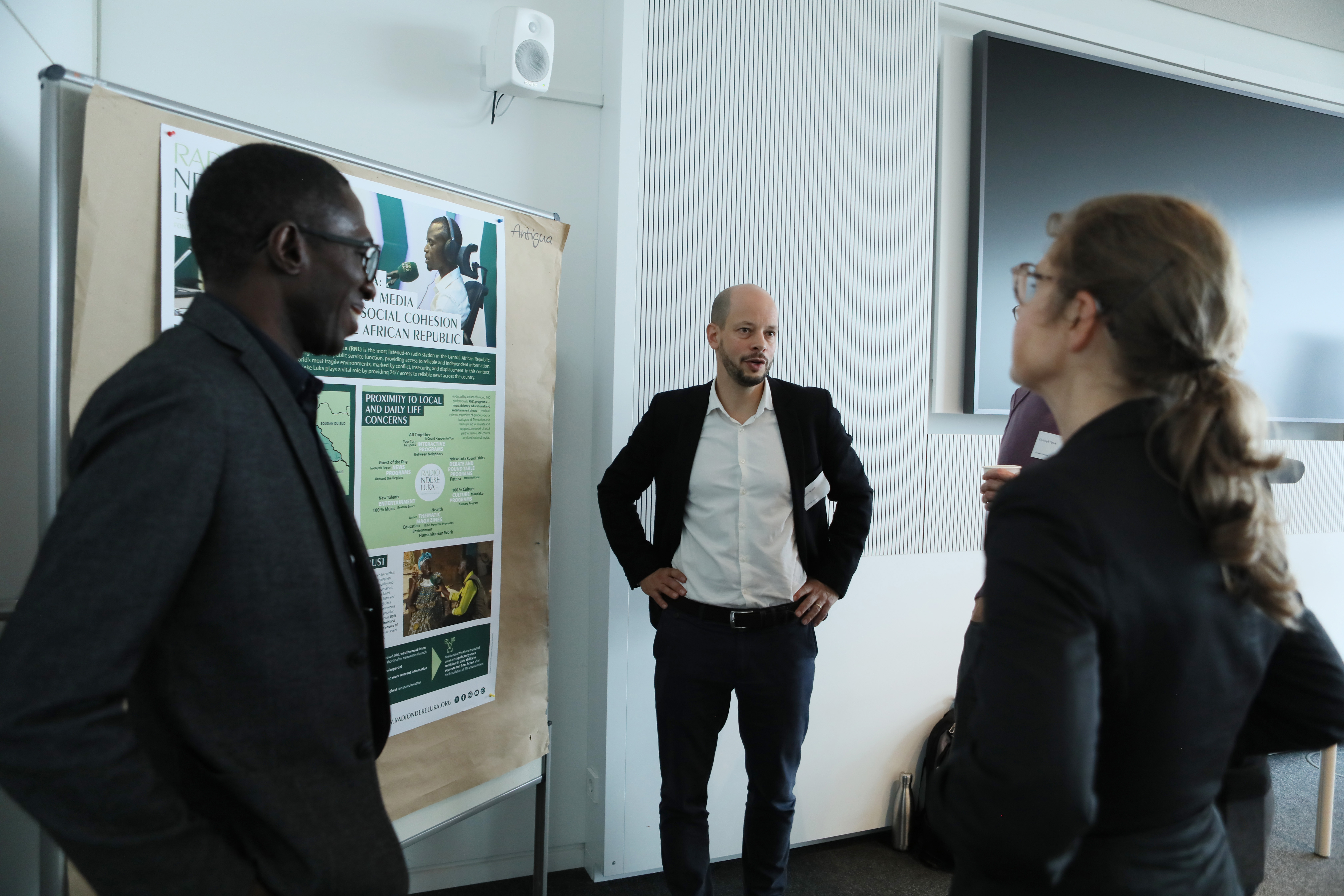 Finally, during a Gallery Walk, Radio Ndeke Luka (RNL), a Fondation Hirondelle media outlet, was highlighted for its role as a public interest media serving trust and social cohesion in the Central African Republic. Sacha Meuter and Ouboulè Abalo underlined its essential role in opening daily spaces for dialogue, giving voice to all Central Africans.