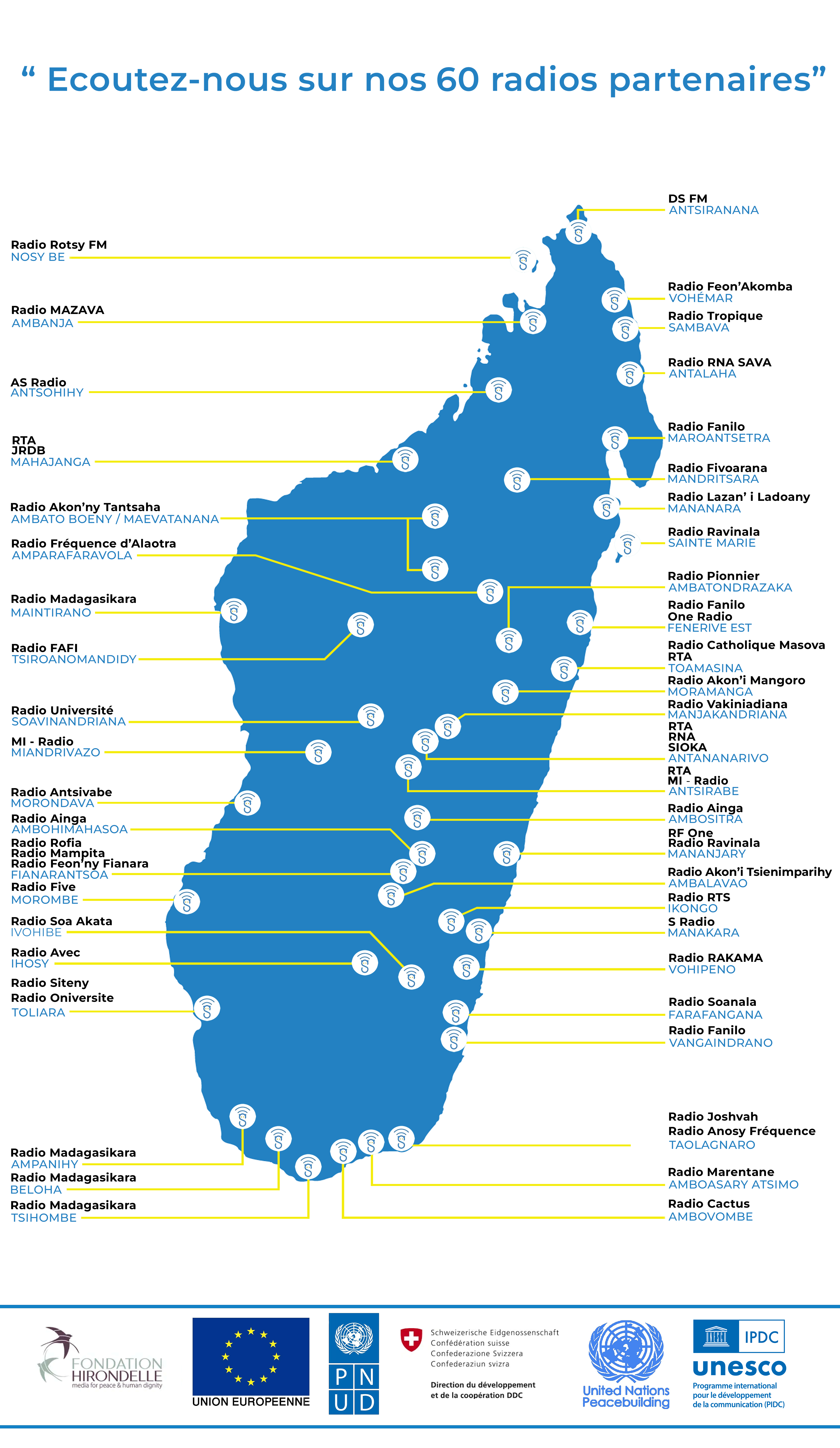 To this end, a daily two-hour programme, broadcast in Malagasy and French, offers national and regional news bulletins, thematic magazines, debates and cultural content. It represents a unique offering in Madagascar, relayed by a network of 60 partner radio stations across the entire island.