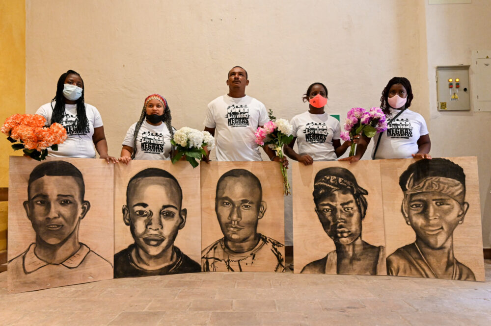 Relatives of five youngsters murdered during mass violences in Colombia, pose with their portraits. House of Memories of Conflict and Reconciliation, Cali, October 2020.
