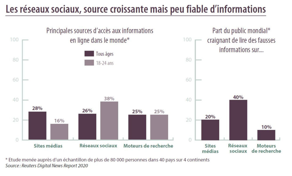 En 2020, les réseaux sociaux étaient la principale source d’information sur l’actualité pour 26 % des utilisateurs d’Internet dans le monde, à quasi-égalité avec les sites médias (28 %) et les moteurs de recherche (25 %). Et ce, notamment auprès des plus jeunes : 38 % des utilisateurs d’Internet âgés de 18 à 24 ans cherchent des nouvelles d’abord sur les réseaux sociaux. Pourtant, quatre ans après le scandale Cambridge Analytica – du nom de la société britannique qui avait massivement diffusé de fausses informations à des profils psychologiques ciblés sur les réseaux sociaux en vue d’influencer leurs votes -, peu a été fait pour améliorer la fiabilité des informations qui y sont partagées. Une vingtaine d’Etats ont légiféré contre la désinformation en ligne, restreignant le spectre des messages qui pouvaient être diffusés sur les réseaux sociaux. Mais certaines de ces lois s’inscrivent dans le cadre de mesure de censure mises en œuvre par des régimes autoritaires. De leur côté, les réseaux sociaux ont commencé à s’atteler à ce problème qui nuit à leur réputation, mais beaucoup reste à faire pour aider le public à s’orienter en ligne vers des informations fiables.