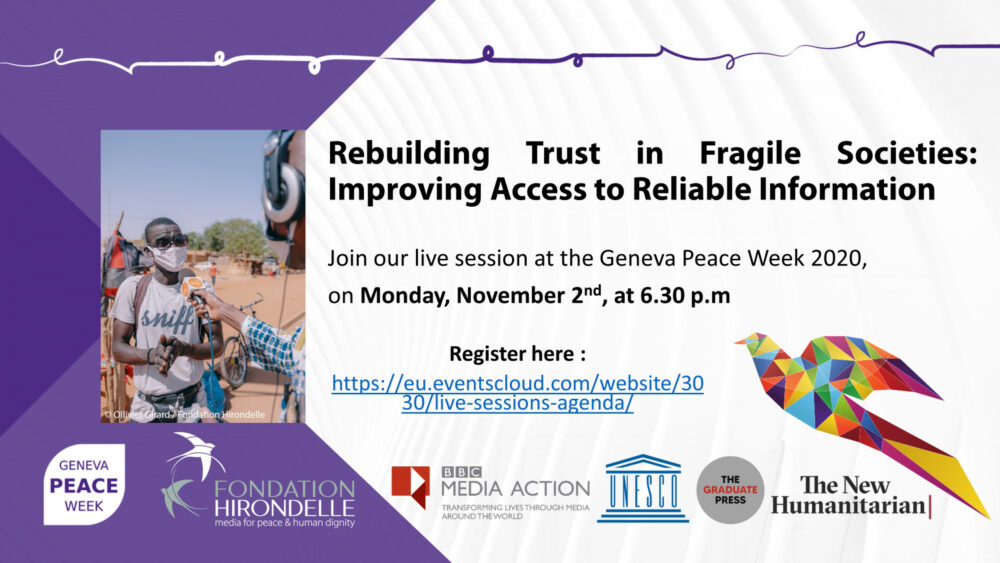 Améliorer l’accès à des informations fiables pour reconstruire la confiance dans des sociétés fragiles : c’est le sujet du webinaire que nous organisons lundi 2 novembre à 18h30 dans le cadre de la Geneva Peace Week 2020, avec l’UNESCO, BBC Media Action, The New Humanitarian et Le Temps. Au programme également, un webinaire sur le Mali organisé par DCAF lundi 2 novembre à 9h et modéré par notre Représentant à Bamako, Martin Faye, et un atelier virtuel sur le fact-checking, mardi 3 novembre à 12h30, co-animé depuis Dakar par Cédric Kalonji, coordinateur éditorial de notre programme en réponse à la désinformation sur la crise COVID-19.