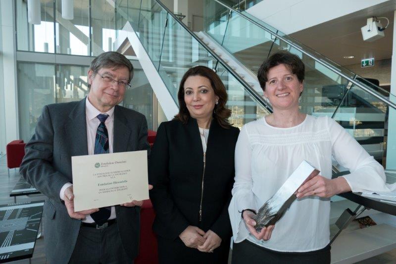 Ouided Bouchamaoui, Prix Nobel de la Paix 2015 avec le Quartet du dialogue national en Tunisie, avec Jean-Marie Etter et Caroline Vuillemin de la Fondation Hirondelle.