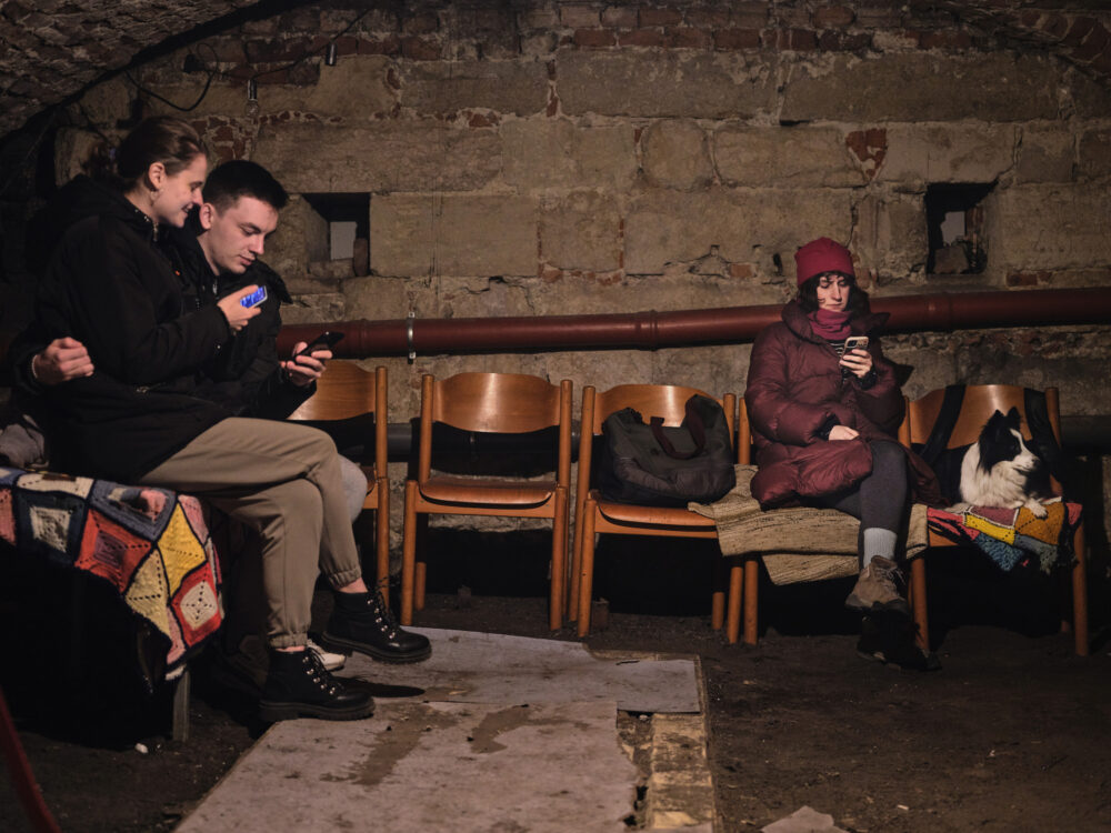 Katerina se cache dans le refuge de Lviv, au sous-sol, pendant l'alerte avec son petit ami et son chien, en Ukraine, 2022.