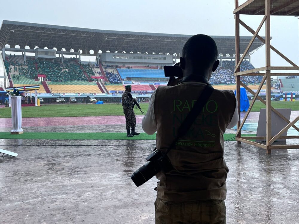 Photo : un journaliste de Radio Ndeke Luka couvre la cérémonie d’investiture du président de la République à Bangui, le 30 mars 2026.© Radio Ndeke Luka