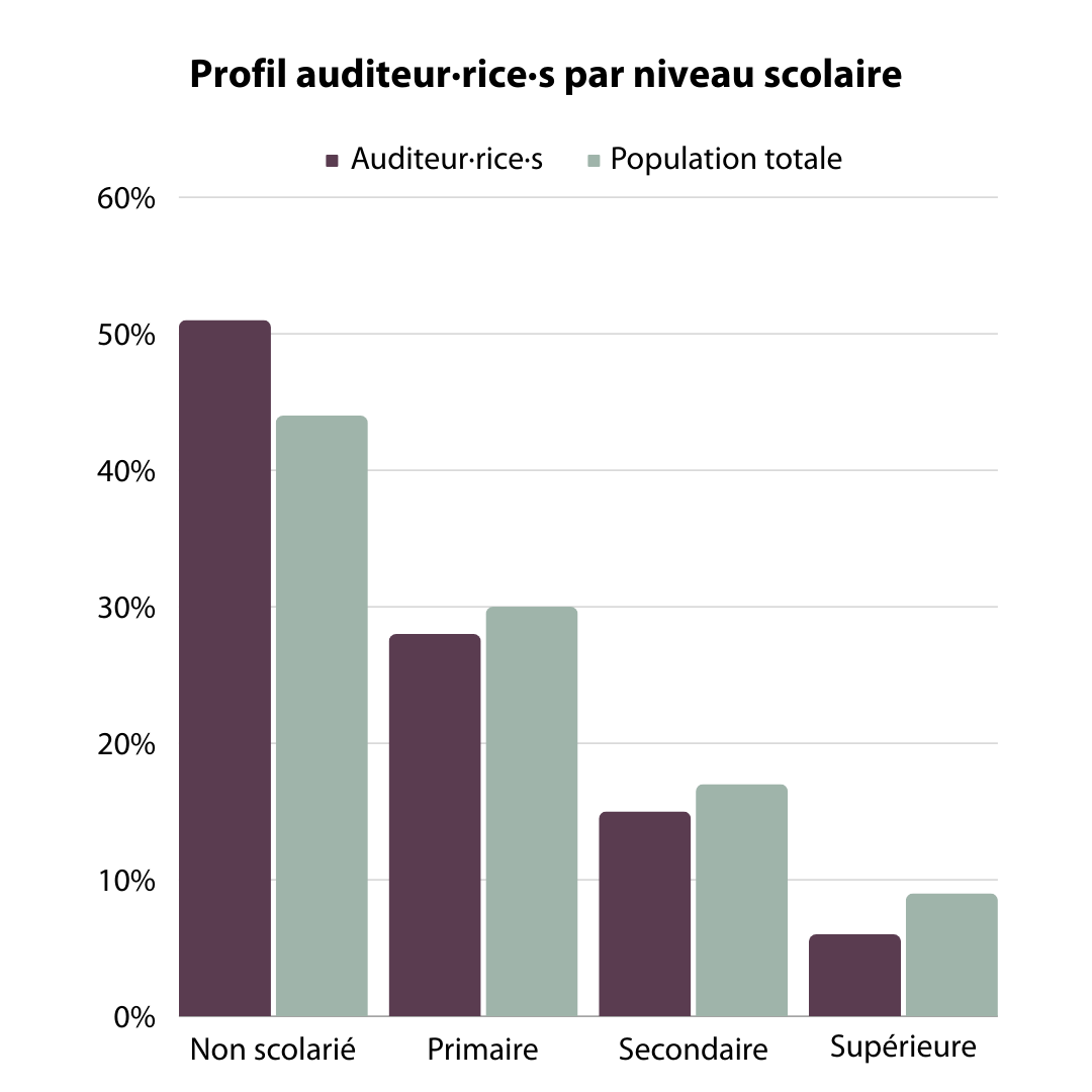 La majorité des auditeur·rice·s de Studio Kalangou ont moins de 35 ans (64%). Les segments non scolarisés de la société sont également très représentés parmi les auditeur·rice·s, avec 51% qui ne sont pas ou n’ont pas été scolarisé·e·s. La radio a un rôle important auprès de ces segments non scolarisés afin de leur apporter l’information oralement, dépassant les barrières de la lecture.